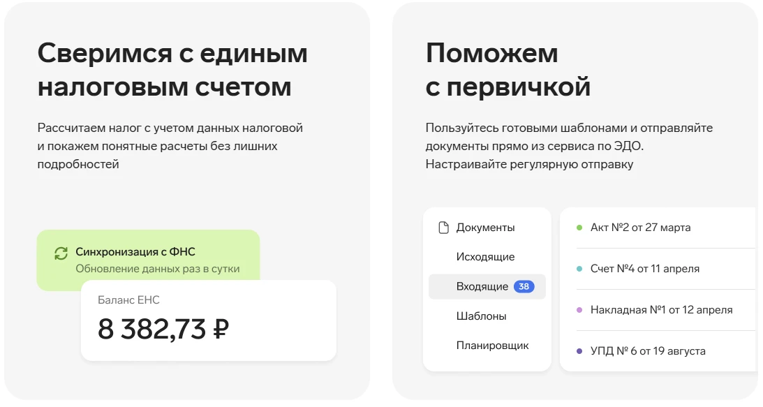 - Помогает создавать счета, акты, накладные и УПД и отправлять их через систему электронного документооборота Диадок.