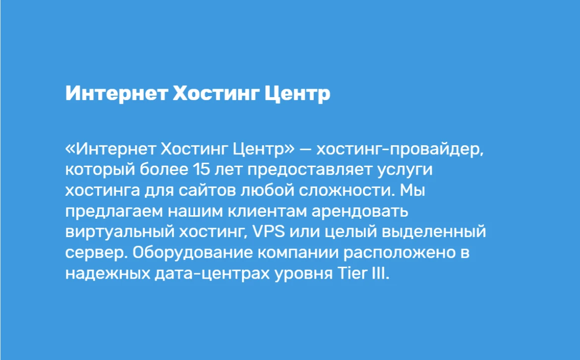 «Интернет Хостинг Центр» — хостинг-провайдер, который более 15 лет предоставляет услуги хостинга для сайтов любой сложности, включая проекты для клиник. Мы предлагаем нашим клиентам арендовать виртуальный хостинг, VPS или целый выделенный сервер. Оборудование компании расположено в надежных дата-центрах уровня Tier III.